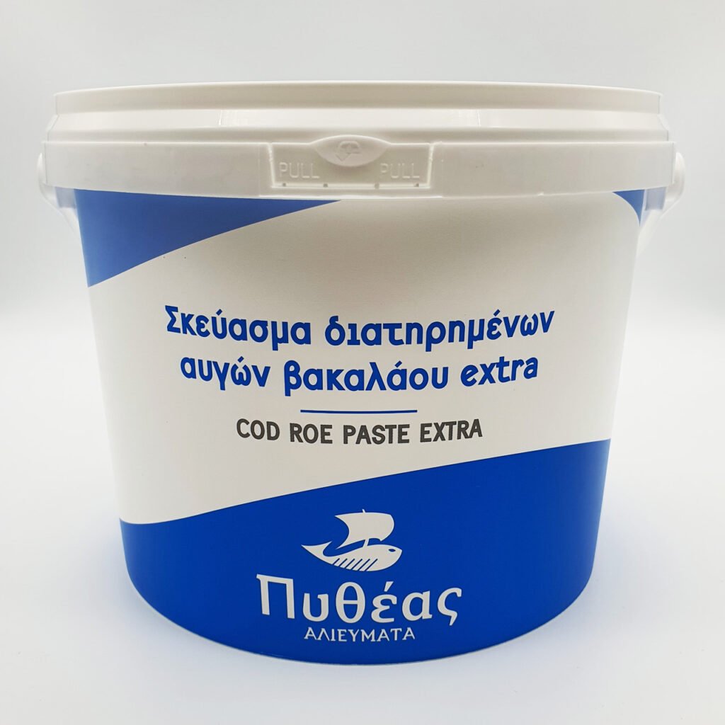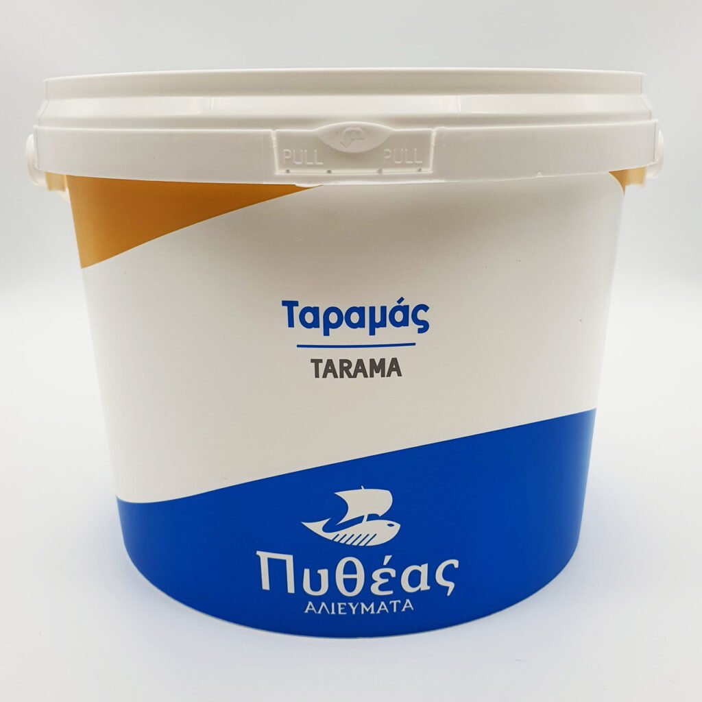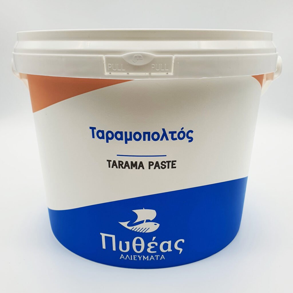 *Ο Ταραμάς ΠΥΘΕΑΣ προέρχεται από παστωμένα αυγά ψαριών Ισλανδίας και Νορβηγίας που έχουν λιγότερο έντονο χρώμα και είναι αυτό που λέμε “λευκός ταραμάς”.