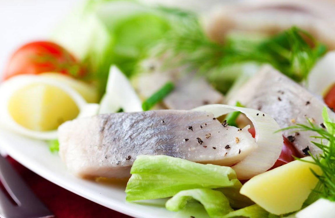 Σερβίρουμε βάζοντας σε ένα πιάτο μαζί, το λάχανο, τις πατάτες και τη ρέγγα και περιχύνουμε με τη βινεγκρέτ.